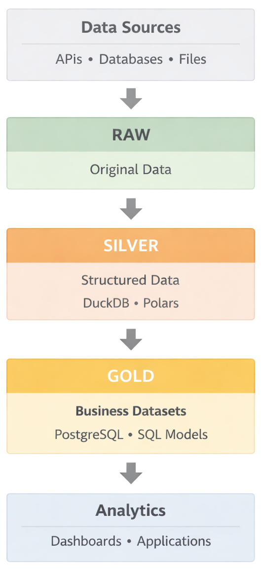 - Simple architectures can still support strong analytics. A lean architecture typically moves data through clear stages from raw data to structured datasets and finally to business ready models. Tools such as Python, DuckDB or Polars, PostgreSQL, and business intelligence platforms provide a reliable foundation without unnecessary complexity.